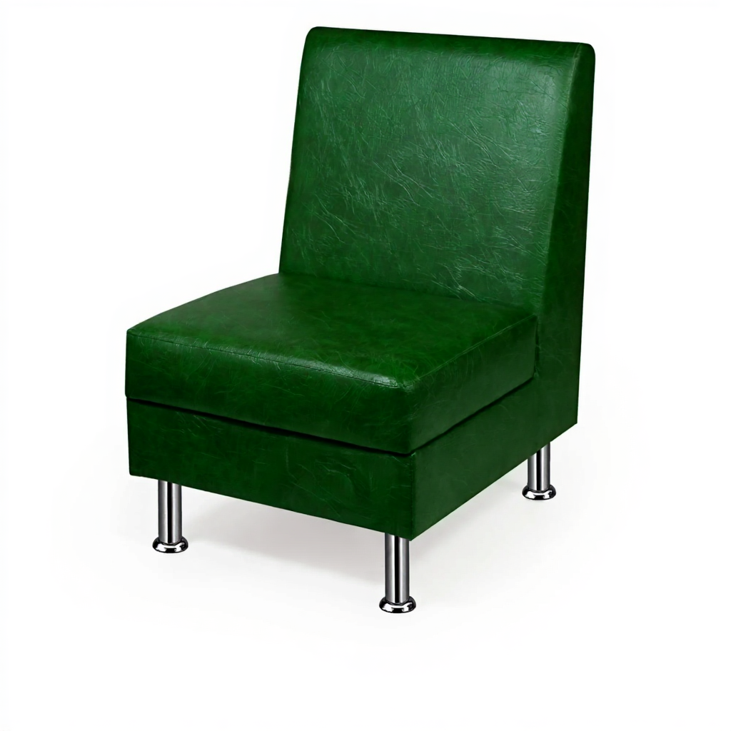 Опоры диван-кресла хромированные. Модель не снабжается раскладным механизмом, что делает ее компактной и удобной для небольших помещений.