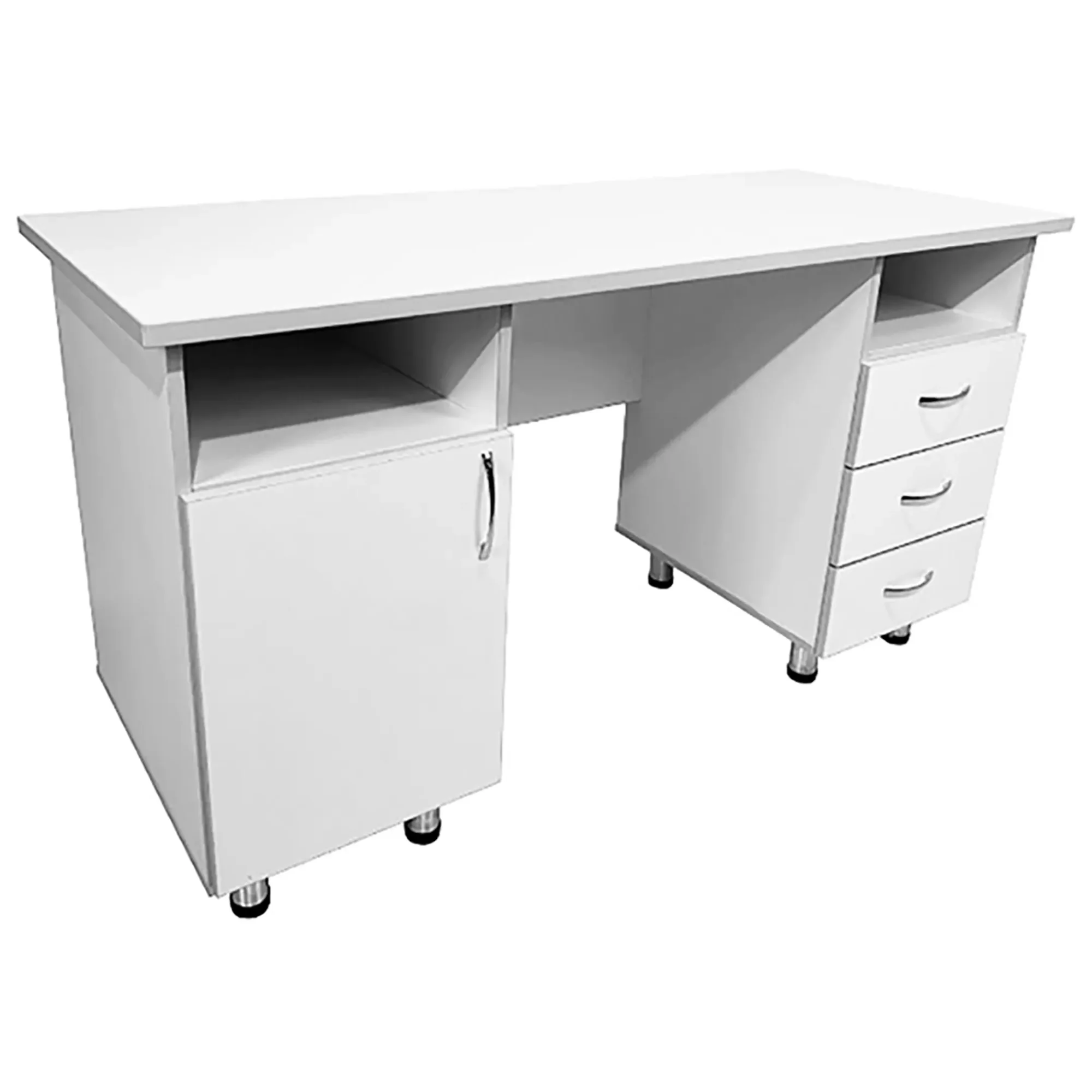 • Этот стол оснащен экраном и ручками-скобами хромированными размером 96 мм, добавляющими удобства в использовании. Разнообразные размеры ниши, ящиков и полок обеспечивают достаточно места для организации рабочего пространства.