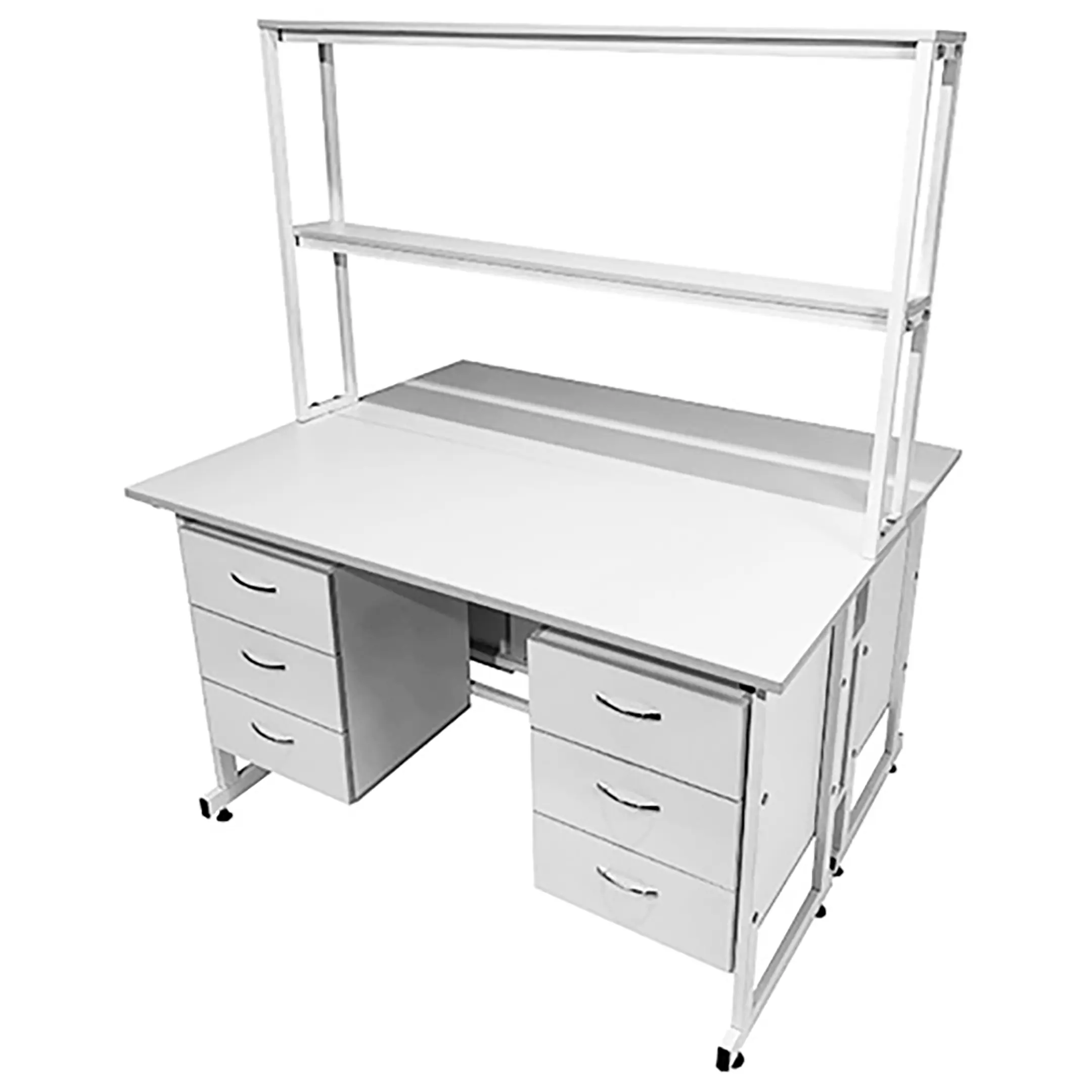 Стол лабораторный островной с надстройкой Сло 22.017 (белый) — это превосходное решение для создания двух рабочих мест в лабораториях и медицинских учреждениях, оптимизирующее использование пространства и обеспечивающее комфорт и функциональность на рабочем месте. Модель оснащена двумя рабочими местами, каждое с двумя подвесными тумбами, имеющими три выдвижных ящика, и центральной надстройкой с двумя полками. Каркас выполнен из стального профиля, столешницы из ЛДСП толщиной 22 мм.