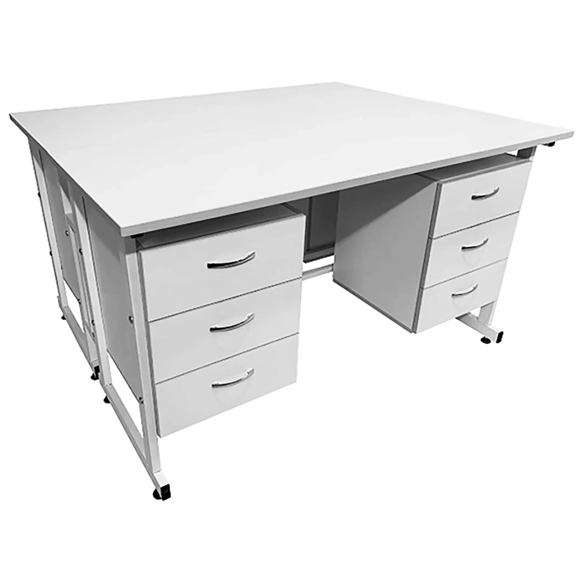 Стол лабораторный островной Сло 22.005 (белый) — это идеальное решение для организации двух рабочих мест в лаборатории, медучреждениях или других подобных местах. Модель поможет максимально эффективно использовать пространство помещения благодаря своей функциональности. Каждое рабочее место оборудовано двумя подвесными тумбами, каждая с тремя выдвижными ящиками. Каркас выполнен из стального профиля, столешницы из ЛДСП толщиной 22 мм.