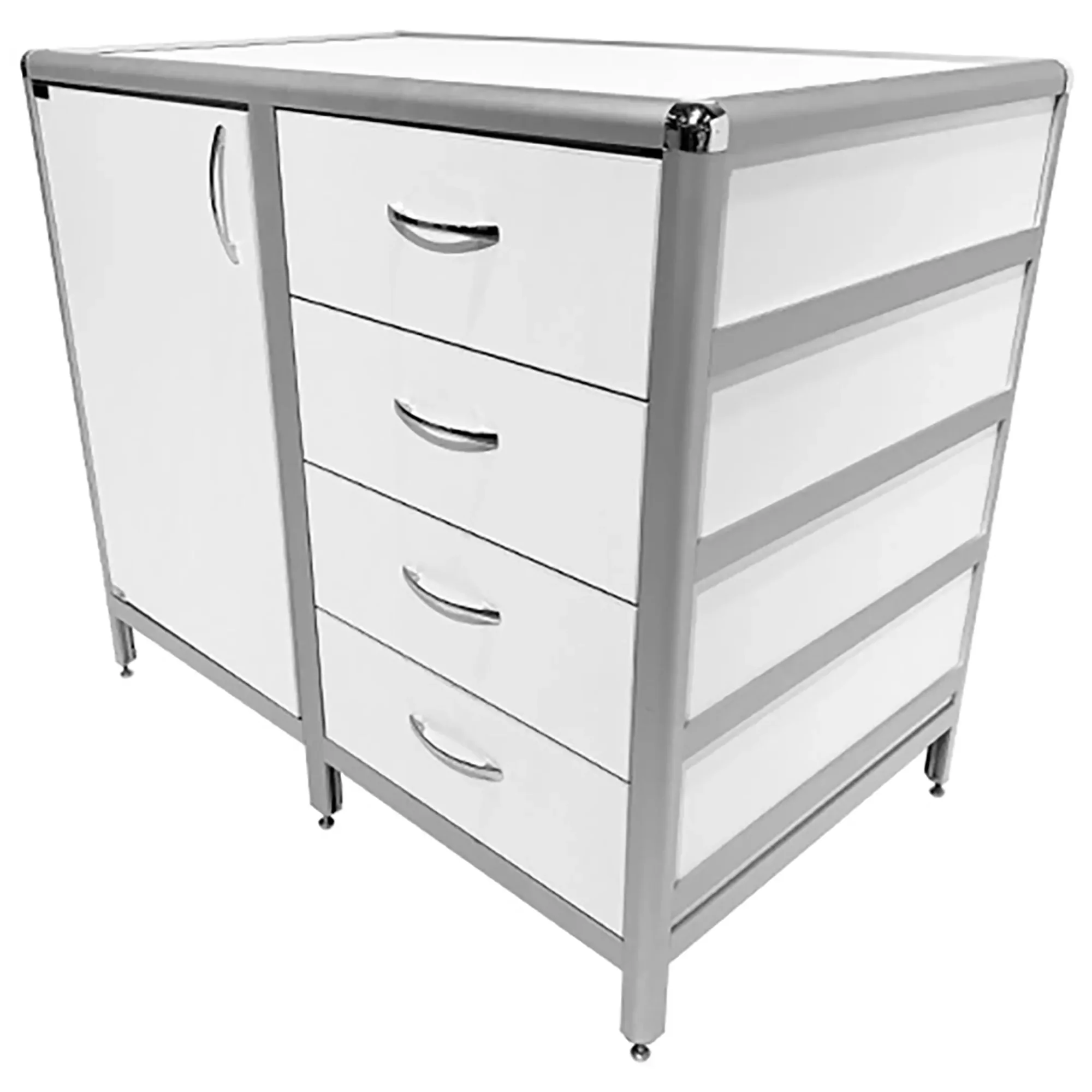 Стол-тумба лабораторная MED 12.012al (белый) — это функциональное решение для хранения лабораторного инвентаря, приборов и материалов в лабораториях и медицинских учреждениях. Модель оснащена тумбой с дверкой и полкой внутри (полка 463х545 мм), а также отделением с четырьмя выдвижными ящиками. Каркас выполнен из алюминиевого профиля, столешница из ЛДСП толщиной 16 мм.