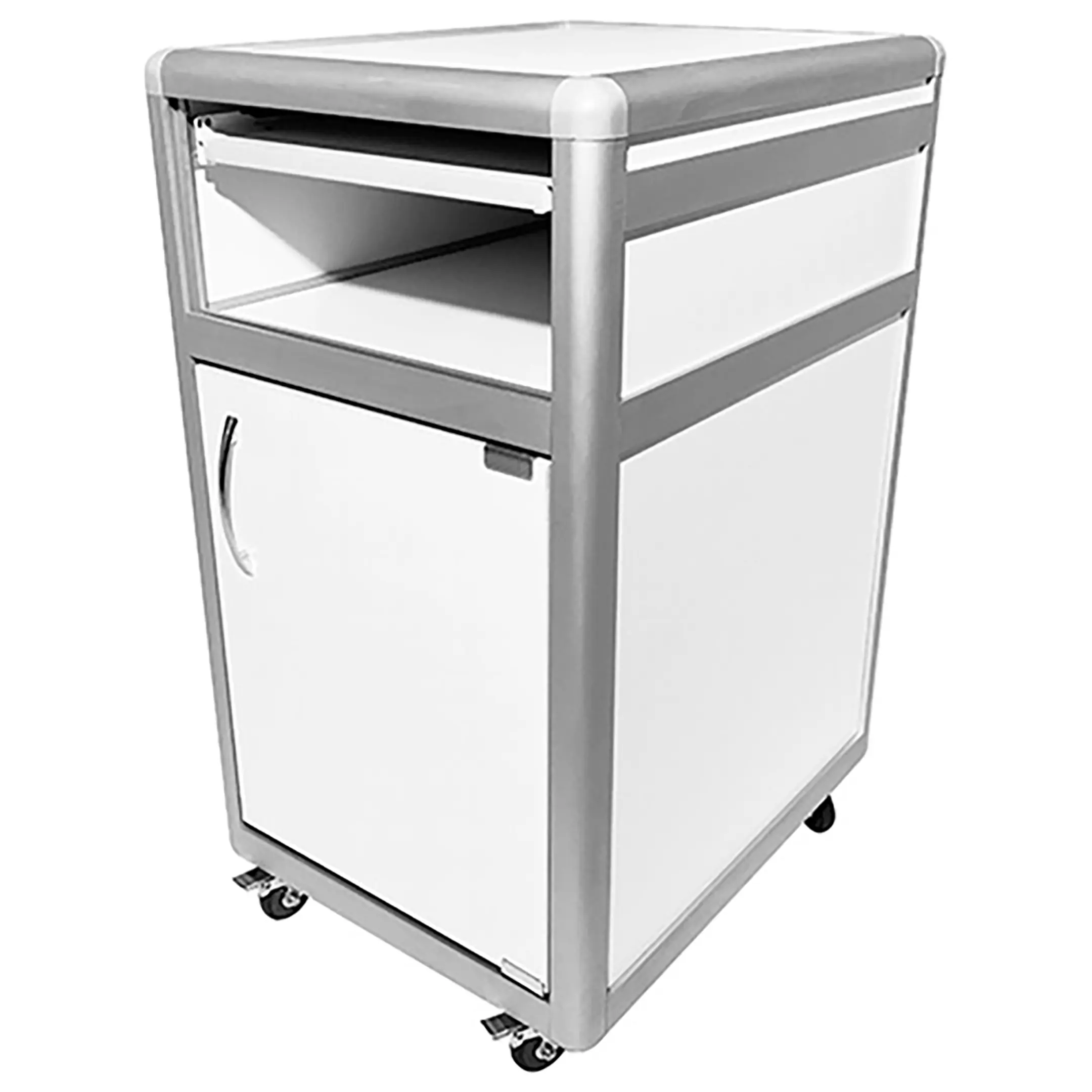 - Функциональная организация — выдвижная полка, открытая ниша и отделение с распашной дверкой и полкой для удобного хранения.