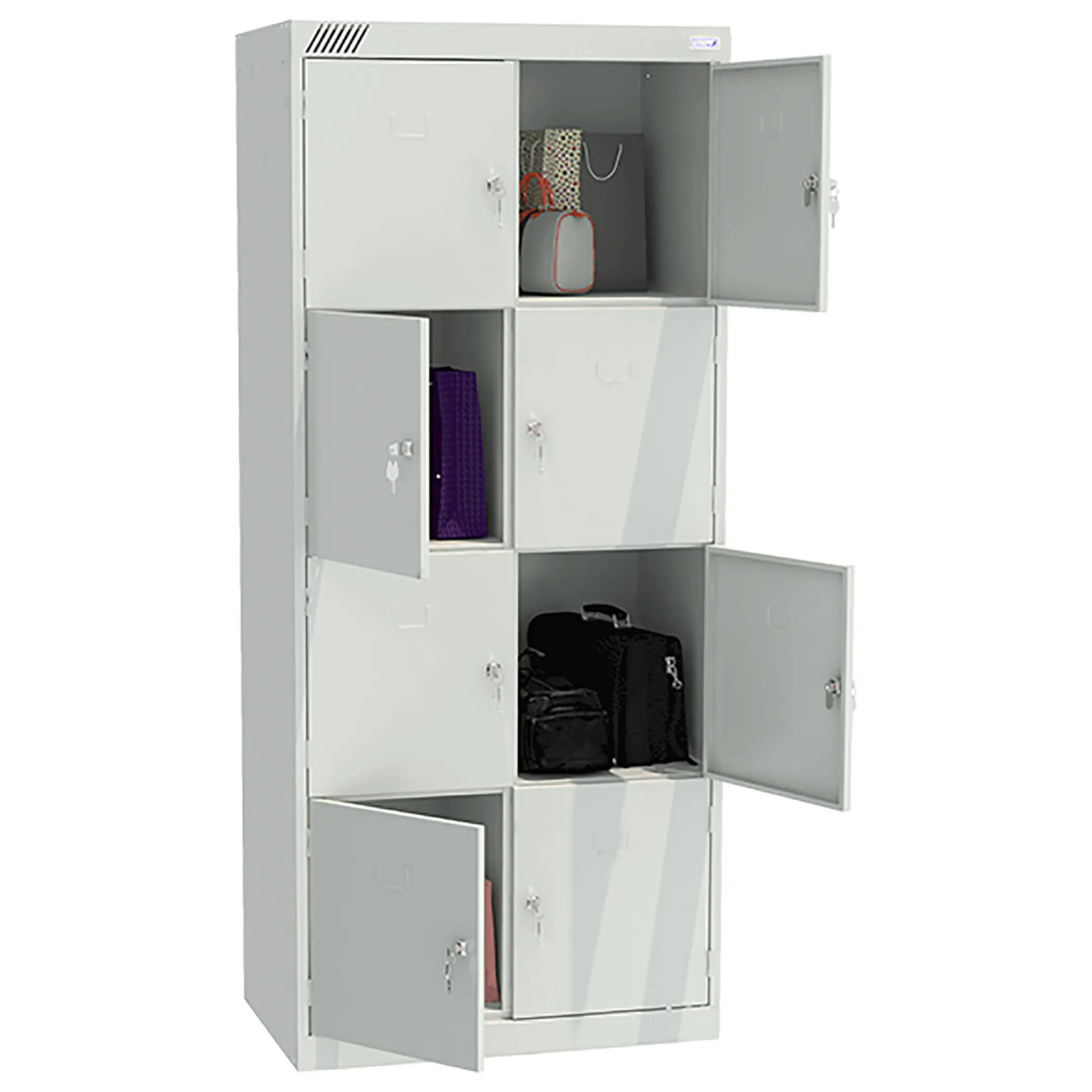 - Вместительная конструкция — две секции и восемь ячеек обеспечивают индивидуальное хранение для нескольких человек.