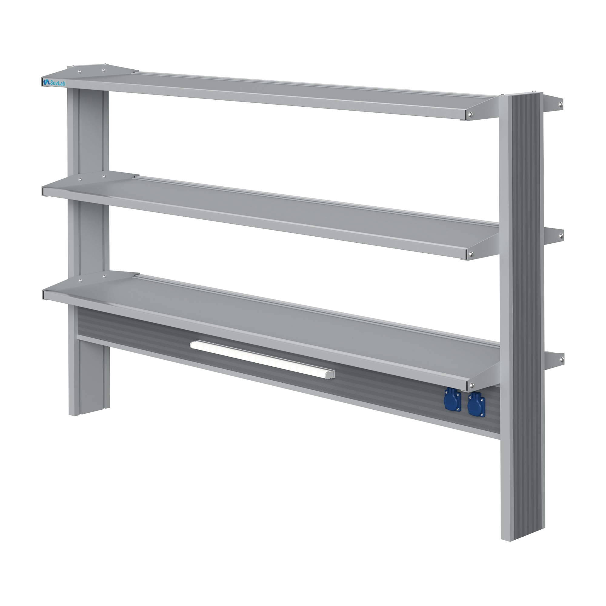 Технологический высокий островной стеллаж Mod. 1800 ТСОв — это специализированное лабораторное оборудование, устанавливаемое на рабочую поверхность островных столов и предназначенное для размещения лабораторной посуды, расходных материалов, инструментов, приборов и другого лабораторного оборудования. Модель оснащена тремя полками, блоком электророзеток и светодиодными светильниками для местного освещения.