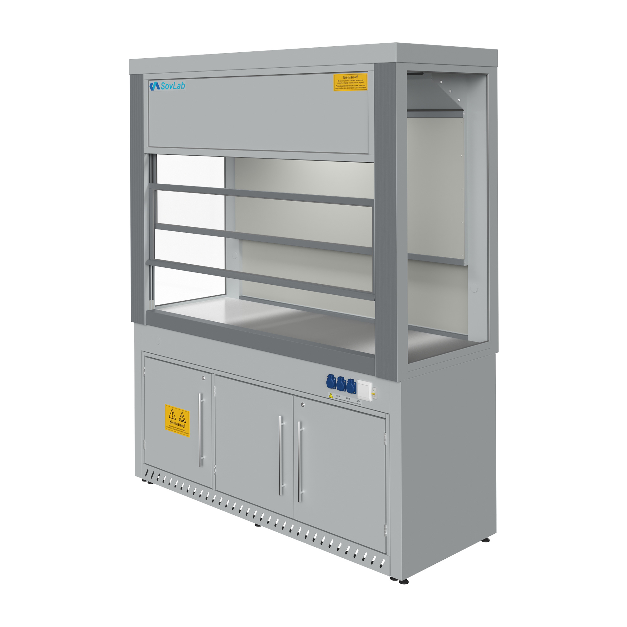 - Безопасная работа с летучими веществами — вертикально-подъемный защитный экран из ударопрочного стекла с системой противовесов для плавного хода и фиксации.
