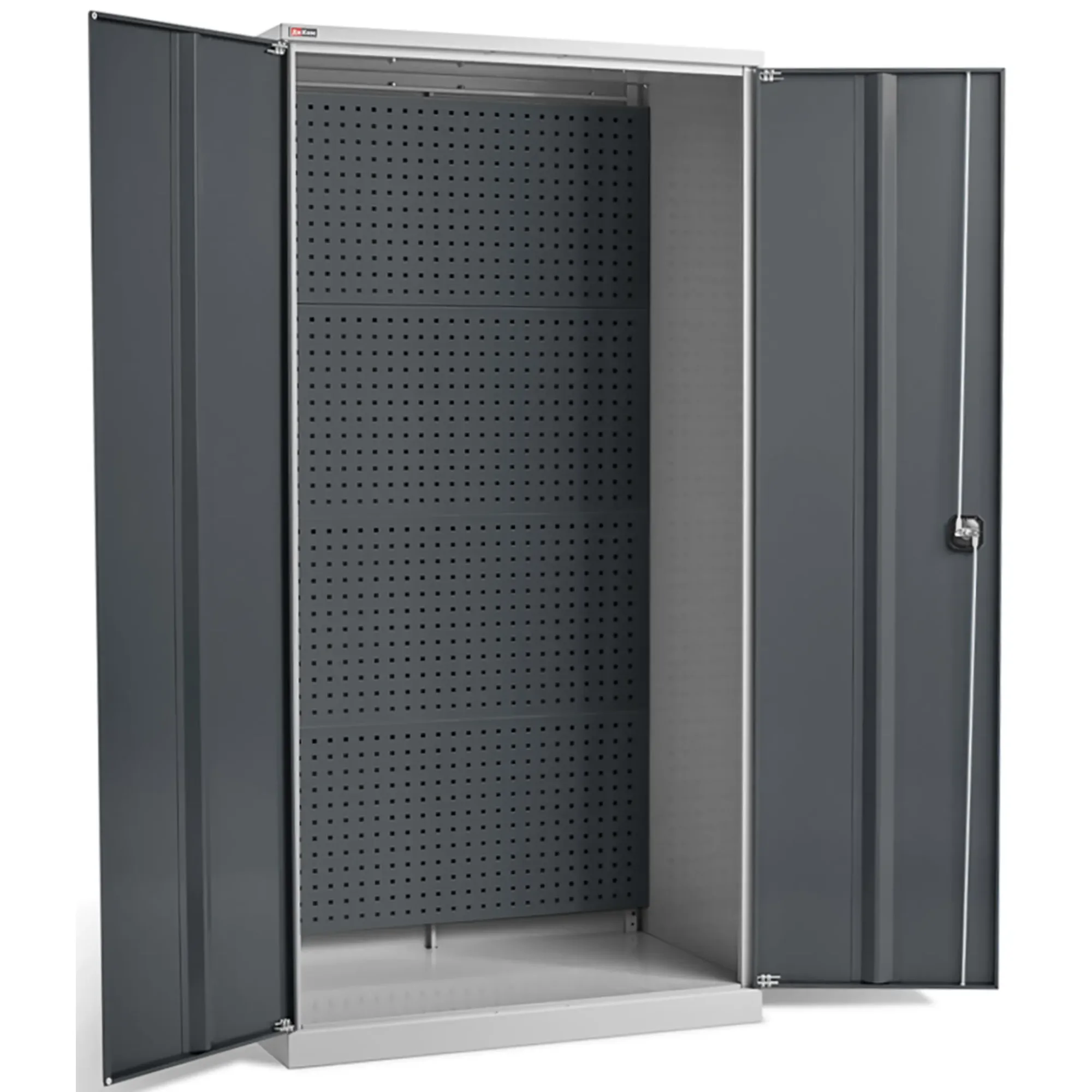 - Эффективная организация и наглядность — шкаф оборудован перфорированной панелью (системой «перфо») на внутренней стороне дверей, позволяющей удобно и компактно разместить ручной инструмент на крючках и держателях. Это обеспечивает мгновенный визуальный контроль наличия всех предметов, экономит время на поиск и способствует поддержанию идеального порядка на рабочем месте.