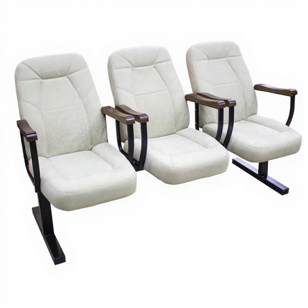 Каркас металлический, сиденья и спинка мягкие, подлокотники. Для мягких частей мы используем искусственную кожу или флок. Кресло для актового зала "Комо люкс" может быть 2-х, 3-х и 4-х местным .