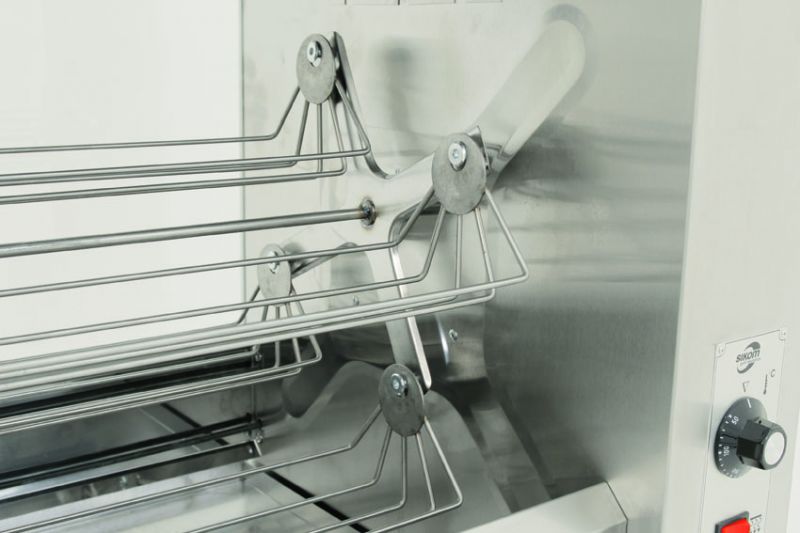 - Привод вращения вертела с автоматическим тормозом — предотвращает самопроизвольный проворот вертела при загрузке и выгрузке продукции.