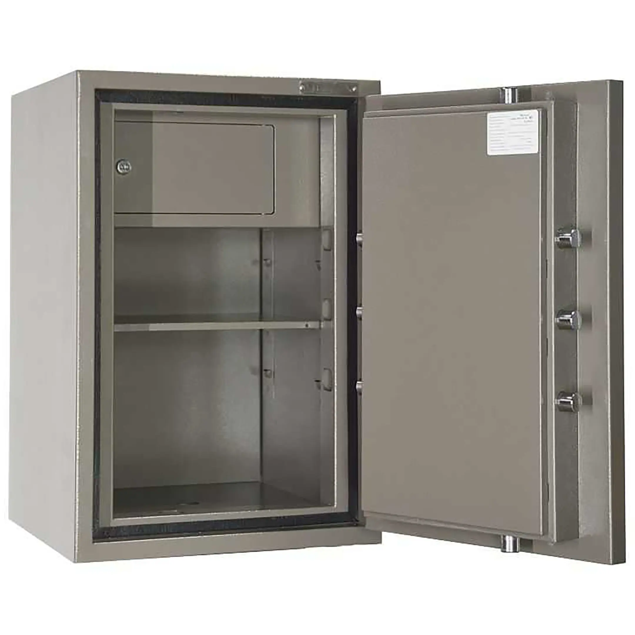 Заготовка комплектующих для данного шкафа производится методом лазерной резки, что позволяет добиться высокого качества и эстетичного вида изделия. Разработанная конструкторско-техническим отделом нашей фирмы система запирания двери, обеспечивает надежную фиксацию двери в закрытом состоянии. Мощные ригеля d 24 мм с защитой от высверливания и выбивания способны выдержать высокие нагрузки возникающие при попытке несанкционированного открывания двери Вашего сейфа. Наличие анкерного крепления к полу позволяет обезопасить Ваш сейф от изъятия из помещения.