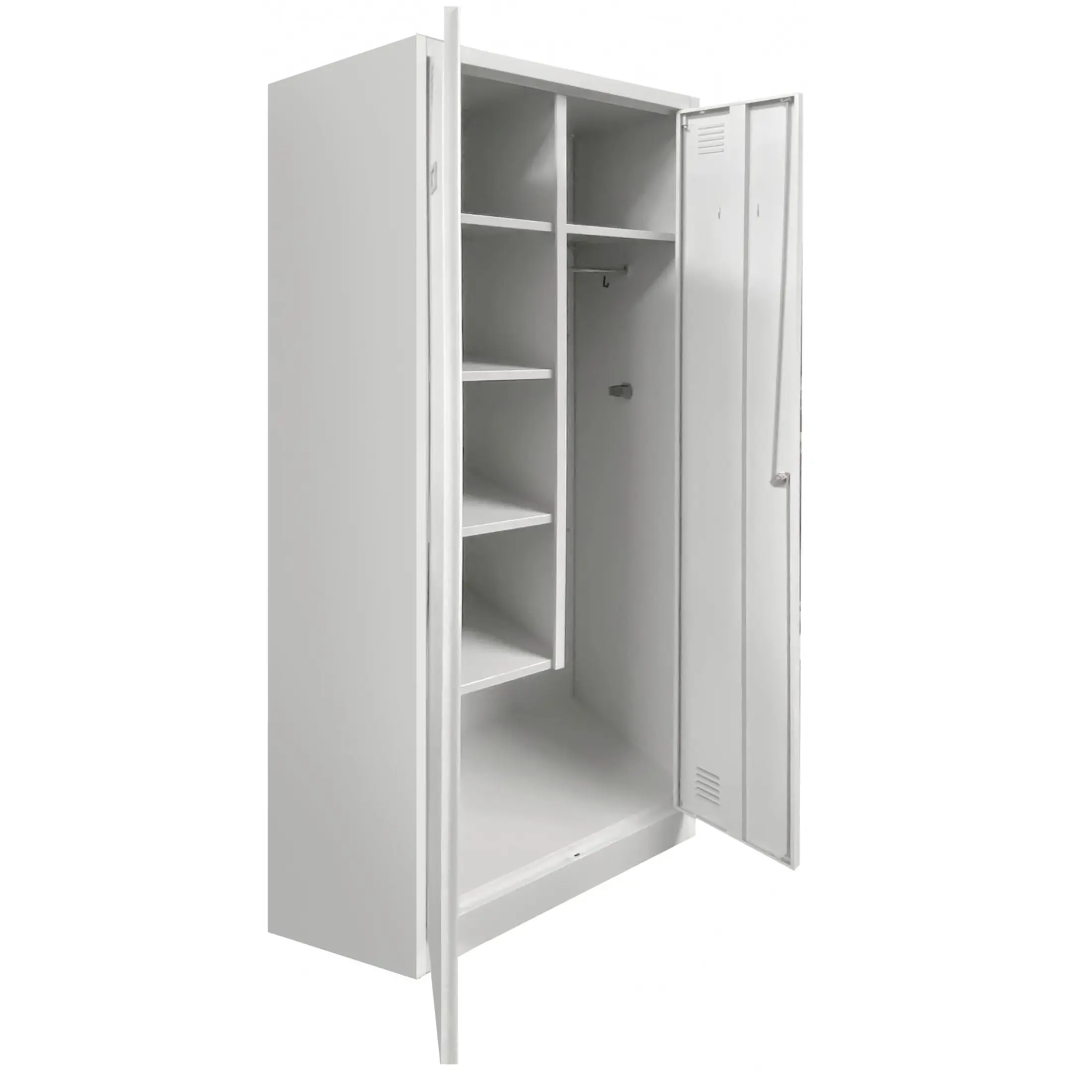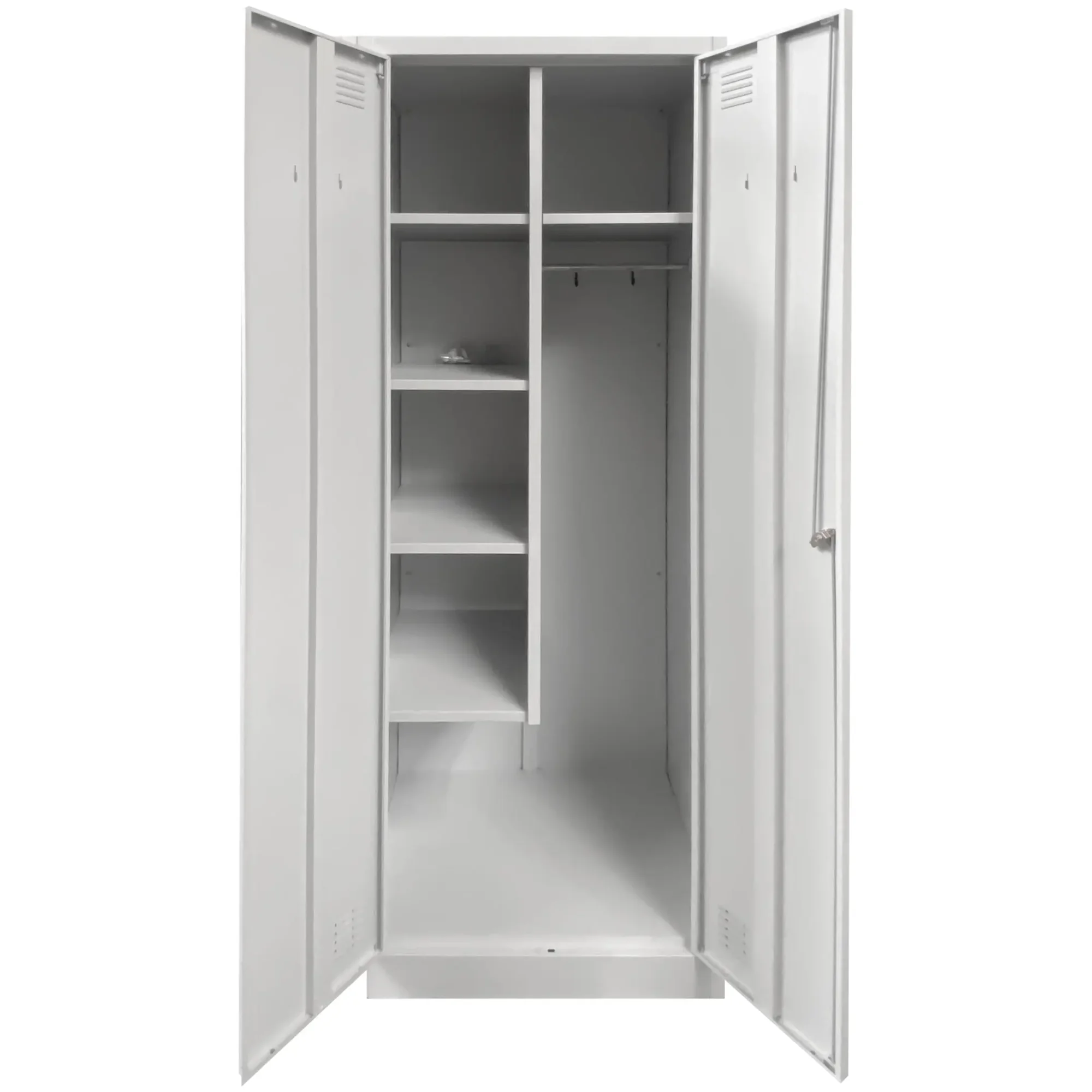 - Универсальность применения — шкаф может использоваться не только для хранения уборочного инвентаря, но и для размещения рабочей одежды, небольшого инструмента, запасных материалов и других хозяйственных принадлежностей.