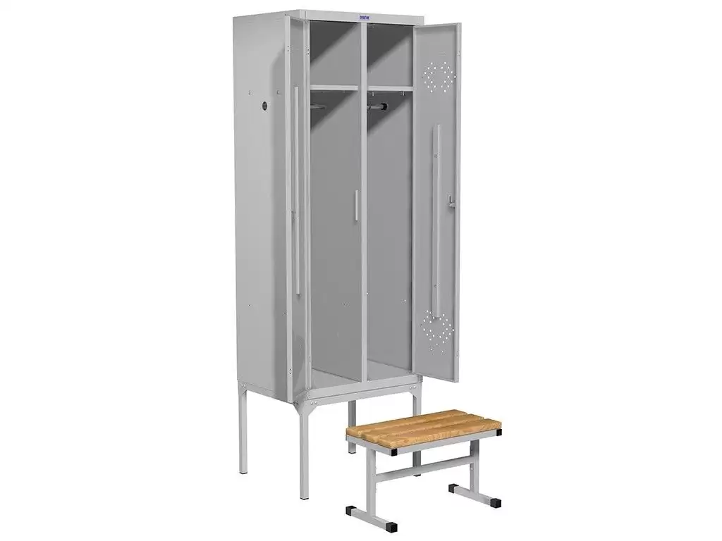 Шкаф для раздевалки ПРАКТИК LS-21-60 на подставке с выдвижной скамье предназначен для хранения одежды в производственных, спортивных и других помещениях, а также для организации камер хранения.