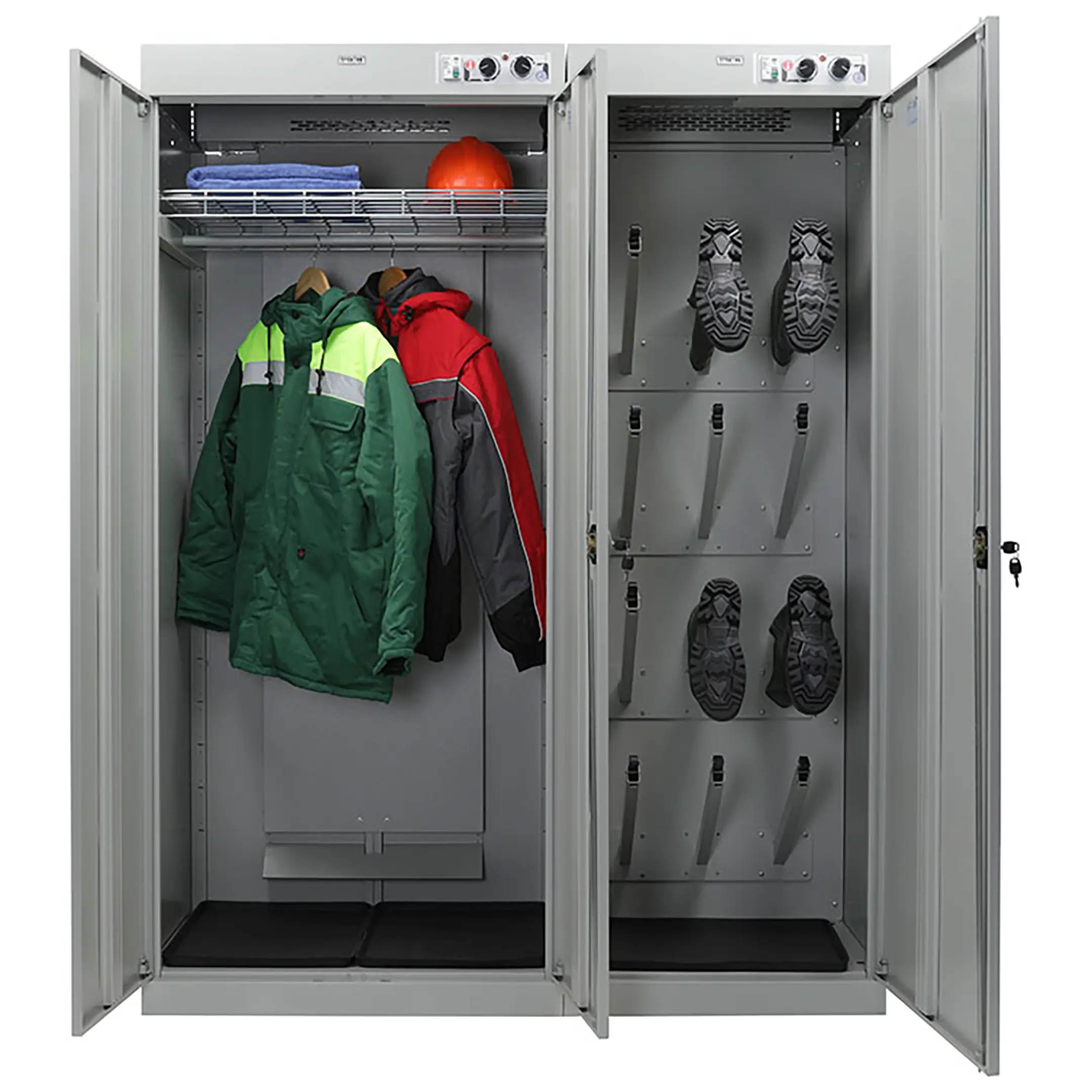 - Универсальность применения — шкаф подходит для сушки различных типов изделий: рабочей и спортивной одежды, спецодежды, обуви, полотенец и инвентаря, что делает его многофункциональным решением для разных сфер деятельности.
