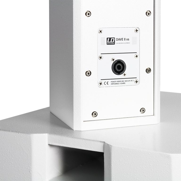 В сабвуфер встроен высокопроизводительный усилитель класса AB. Мультимедийная система LD DAVE 8 XS W имеет линейные входы на разъемах XLR и RCA и оснащена всеми стандартными системами защиты. Встроенный лимитер защищает систему от перегрузки и обеспечивает длительный срок службы. На боковой стороне сабвуфера, в дополнение к выключателю ON/OFF и переключателю реверса фазы (180°), имеется отдельный регулятор громкости, который позволяет найти идеальный баланс ярких высоких частот и мощного баса. Сателлиты оснащены 16-мм фланцем и поэтому совместимы со стойками из комплекта DAVE 8 SET 2.